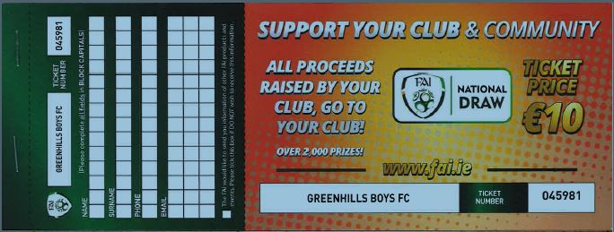 The club are selling tickets for the FAI National Draw. Tickets are €10 each and the prizes are listed below but some of the prizes are Cars , Mobile phones , Match tickets etc…