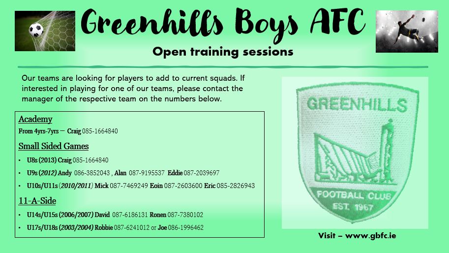 - U17s/U18s (2003/2004) Robbie 087-6241012 or Joe 086-1996462